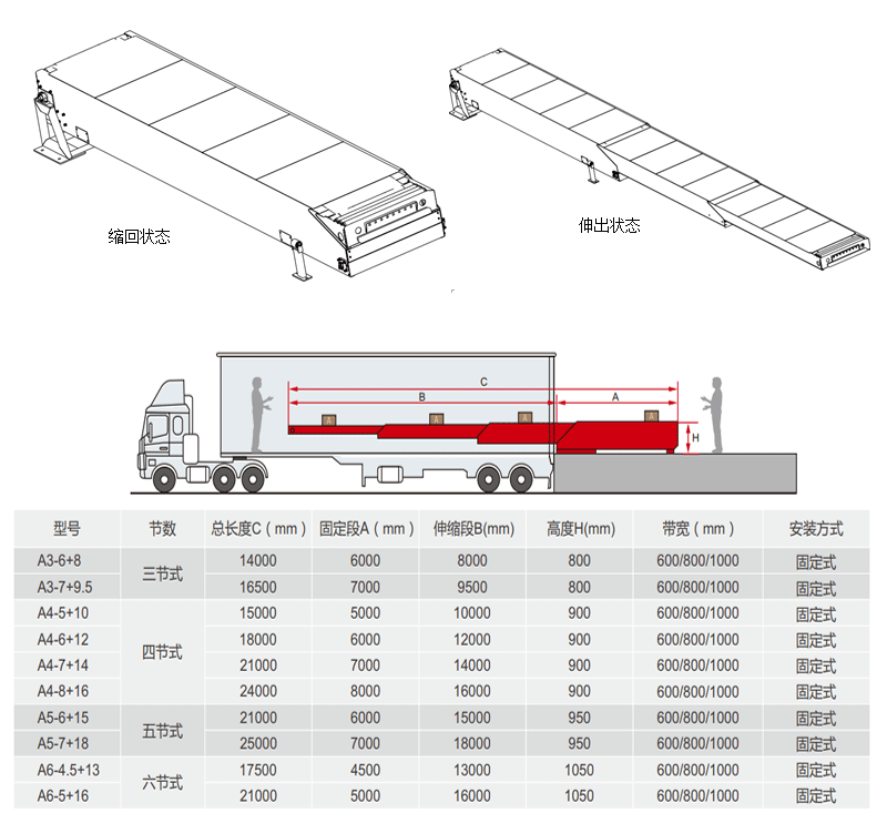 伸缩装车输送机,安全高效的装车与卸车。它最大的好处是符合人体工程学的操作条件,通过一个操作杆或操作按钮,即可实现伸缩机到达操作者需要的任何位置,通过任意的伸缩运动,完成货物的轻松高效装卸。整个伸出或缩回的动作,是通过电动快速响应反馈于操作者,用户可以根据车厢长度选择我们的产品型号,也可以与我们的销售团队联系,得到我们合理的建议。